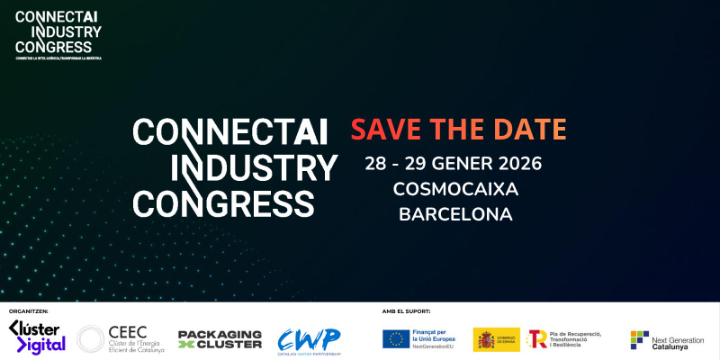 Els pròxims 28 i 29 de gener de 2026, el CosmoCaixa de Barcelona acollirà el ConnectAI Industry Congress, una iniciativa pionera impulsada pel Clúster Digital de Catalunya, el Clúster de l’Energia Eficient de Catalunya (CEEC), el Catalan Water Partnership (CWP) i el Clúster Packaging, amb el suport del Fons Next Generation EU en el marc del programa RETECH i d’ACCIÓ.