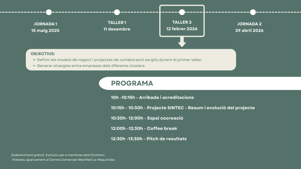 Aquest segon taller forma part d’un itinerari de treball del projecte SINTEC que va començar en una primera jornada, durant el mes de maig, on es van identificar reptes compartits i necessitats comunes entre les empreses participants. En aquesta sessió treballarem per a definir els models de negoci i projectes de col·laboració que es van començar a treballar en el primer taller que va tenir lloc el passat mes de desembre. Culminarem aquest projecte en una jornada final el 29 d’abril del 2026, on es presentaran les conclusions i oportunitats identificades.