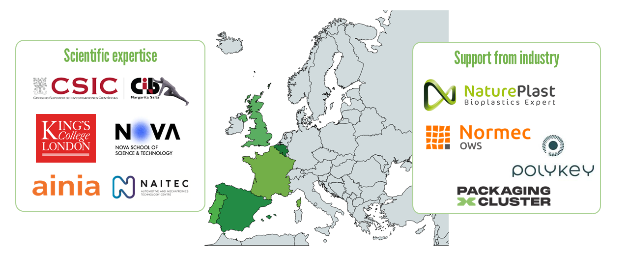 SATISPHACTION is a 4-year project coordinated by Ainia and involves 9 partners from 5 different European countries: France, UK, Belgium, Portugal and Spain. The consortium blends the scientific and technical expertise provided by universities and R&D centres (AINIA, the Margarita Salas Centre for Biological Research CIB-CSIC, NOVA University Lisbon, King’s College London and NAITEC) and the support of innovative plastic companies (Natureplast and Polykey), sustainability certification experts (Normec OWS) and packaging industry representatives (Packaging Cluster).
