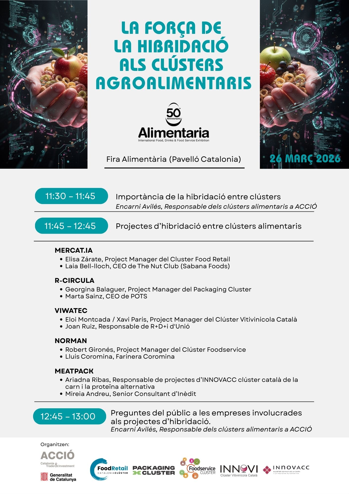 12:45-13:00 Preguntes del públic a les empreses involucrades als projectes d'hibridació amb Encarni Avilés, Responsable dels clústers alimentaris a ACCIÓ