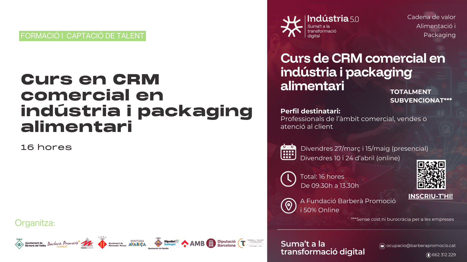 La Fundació Barberà Promoció, en el marc del projecte Treball, Talent i Tecnologia (TTT), organitza el Curs de CRM comercial en indústria i packaging alimentari, una formació dirigida a professionals del sector que vulguin millorar la gestió comercial i la relació amb clients mitjançant eines CRM.